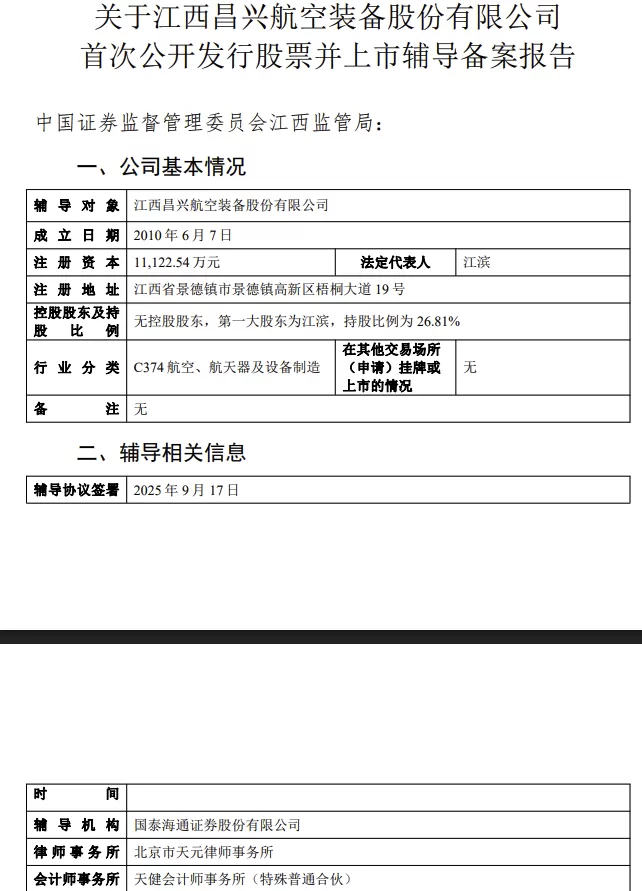 9月26日,中国证监会官方网站公布最新信息,上海超群检测科技股份有限公司已正式开启上市辅导流程,中金公司作为其辅导机构;同日,江西昌兴航空装备股份有限公司也启动了上市辅导工作,国泰海通证券将负责相关辅导事宜。
